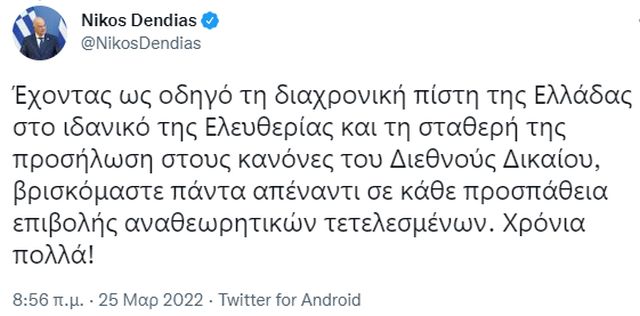 «Έχοντας ως οδηγό τη διαχρονική πίστη της Ελλάδας στο ιδανικό της Ελευθερίας και τη σταθερή της προσήλωση στους κανόνες του Διεθνούς Δικαίου, βρισκόμαστε πάντα απέναντι σε κάθε προσπάθεια επιβολής αναθεωρητικών τετελεσμένων. Χρόνια πολλά!».