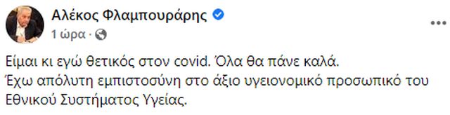 Θετικός στον κορωνοϊό διαγνώστηκε ο πρώην υπουργός Επικρατείας του ΣΥΡΙΖΑ – Προοδευτική Συμμαχία, Αλέκος Φλαμπουράρης, κάτι που ανακοίνωσε ο ίδιος με ανάρτησή του στα social media.