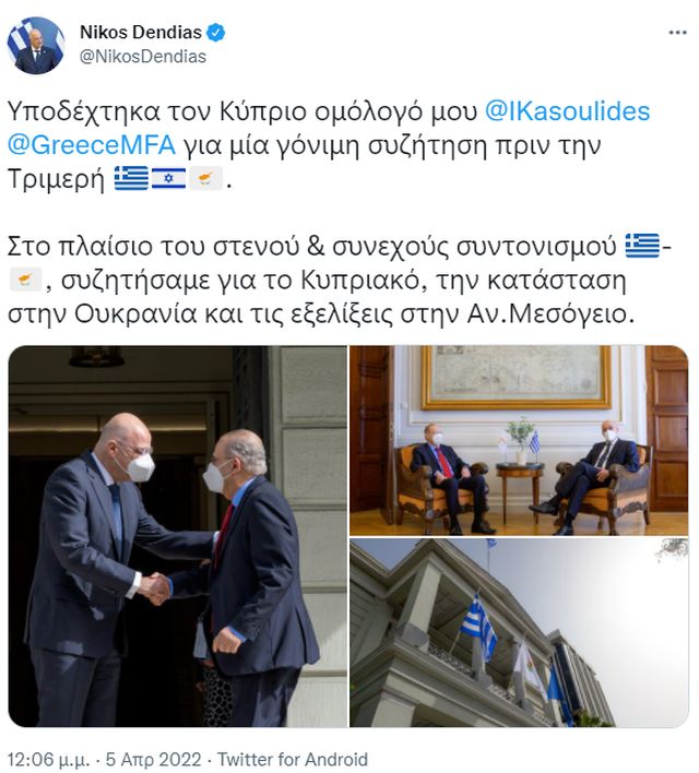 Στην Αθήνα βρίσκονται οι υπουργοί Εξωτερικών της Κύπρου και του Ισραήλ, προκειμένου να συμμετάσχουν στην Τριμερή Συνάντηση των ΥΠΕΞ Ελλάδας, Ισραήλ και Κύπρου.