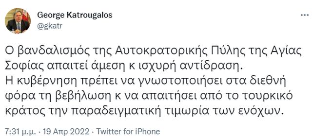 Οργισμένη είναι η αντίδραση του Γιώργου Κατρούγκαλου στον βανδαλισμό της Αυτοκρατορικής Πύλης της Αγίας Σοφίας στην Κωνσταντινούπολη.