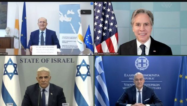 Οι Υπουργοί Εξωτερικών της Κυπριακής Δημοκρατίας, της Ελληνικής Δημοκρατίας, του Κράτους του Ισραήλ και των Ηνωμένων Πολιτειών πραγματοποίησαν τηλεδιάσκεψη σήμερα [Δευτέρα 6/5/22] με στόχο να επαναβεβαιώσουν την κοινή τους δέσμευση για την προώθηση της ειρήνης, της σταθερότητας και της ευημερίας στην Ανατολική Μεσόγειο.