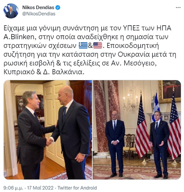 «Είχα μια πολύ ενδιαφέρουσα συνάντηση σήμερα, καταρχάς, με τον Υπουργό Εξωτερικών Α. Blinken.
