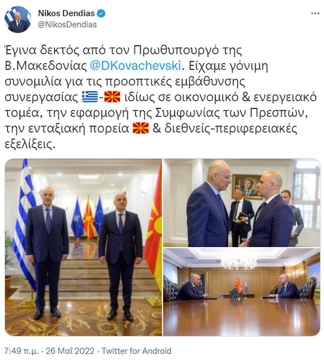 »Στο πλαίσιο αυτό, συζητήσαμε για την εκπλήρωση των υποχρεώσεων που απορρέουν από τη Συμφωνία των Πρεσπών, καθώς και για τον αντίκτυπο της συμφωνίας στη συνολική ανάπτυξη των σχέσεων και της συνεργασίας μεταξύ Βόρειας Μακεδονίας και Ελλάδας» σημείωσε ο υπουργός Εξωτερικών της Βόρειας Μακεδονίας.