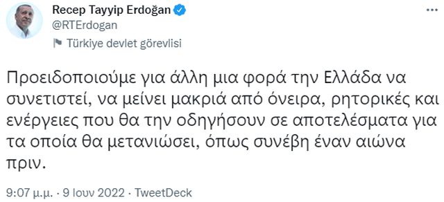 Ο Ταγίπ Ερντογάν επαναλαμβάνει τις απειλές που εξαπέλυσε στην άσκηση EFES 2022, γράφοντας στο Twitter στα Ελληνικά.