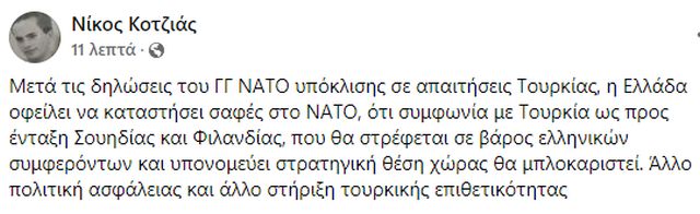 Άμεση ήταν η αντίδραση του Νίκου Κοτζιά στις προκλητικές δηλώσεις του φιλότουρκου Γενς Στόλτενμπεργκ, οποίος νωρίτερα είπε ότι είναι «αποδεκτές» οι ανησυχίες της Τουρκίας για την ένταξη Φινλανδίας–Σουηδίας στο ΝΑΤΟ.