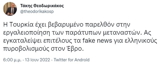Διαψεύδει ο υπουργός Προστασίας του Πολίτη Τάκης Θεοδωρικάκος δημοσίευμα τουρκικής ιστοσελίδας περί επεισοδίου στον Έβρο, κάνοντας λόγο για fake news.
