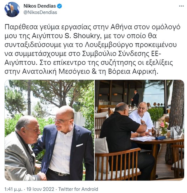 Νωρίτερα, ο Νίκος Δένδιας παρέθεσε στον υπουργό Εξωτερικών της Αιγύπτου, σε παραλιακό εστιατόριο της ελληνικής πρωτεύουσας, γεύμα εργασίας.