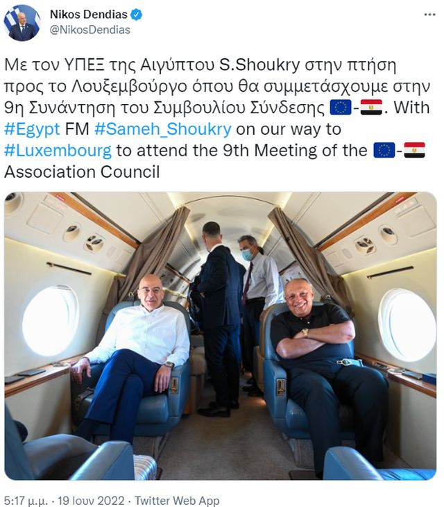 «Με τον ΥΠΕΞ της Αιγύπτου Σάμεχ Σούκρι στην πτήση προς το Λουξεμβούργο, όπου θα συμμετάσχουμε στην 9η Συνάντηση του Συμβουλίου Σύνδεσης ΕΕ-Αιγύπτου» επισημαίνει σε ανάρτησή του στο Twitter ο Ν. Δένδιας, παραθέτοντας σχετική φωτογραφία των δύο υπουργών μέσα από το αεροπλάνο.