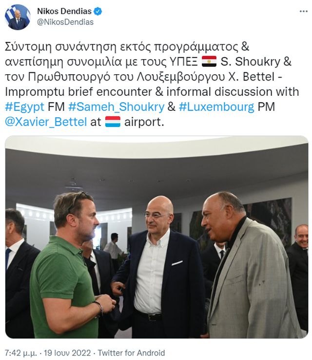 Μετά το γεύμα σε παραλιακό εστιατόριο της Αθήνας, ο υπουργός Εξωτερικών Νίκος Δένδιας και ο Αιγύπτιος ομόλογό τους Σάμεχ Σούκρι συνταξίδεψαν προς Λουξεμβούργο, όπου θα συμμετάσχουν στο 9ο Συμβούλιο Σύνδεσης Ευρωπαϊκής Ένωσης – Αιγύπτου.