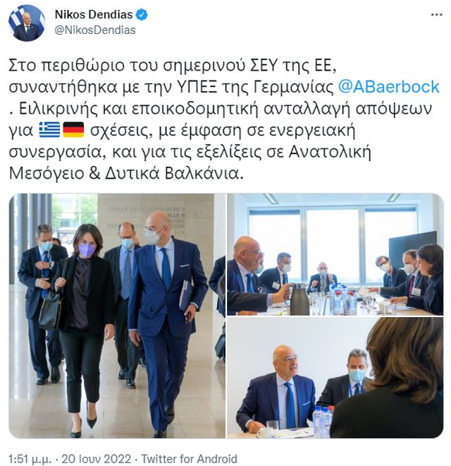 «Ειλικρινής και εποικοδομητική ανταλλαγή απόψεων για ελληνο-γερμανικές σχέσεις, με έμφαση σε ενεργειακή συνεργασία, και για εξελίξεις σε Ανατολική Μεσόγειο και Δυτικά Βαλκάνια» αναφέρεται σε σχετική ανάρτηση του υπουργείου Εξωτερικών στο Τwitter.