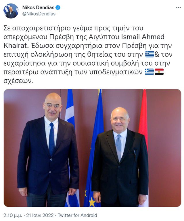Ο υπουργός Εξωτερικών Νίκος Δένδιας παρέθεσε την Τρίτη αποχαιρετιστήριο γεύμα προς τιμήν του απερχόμενου Πρέσβη της Αιγύπτου Ισμαήλ Χαϊράτ.