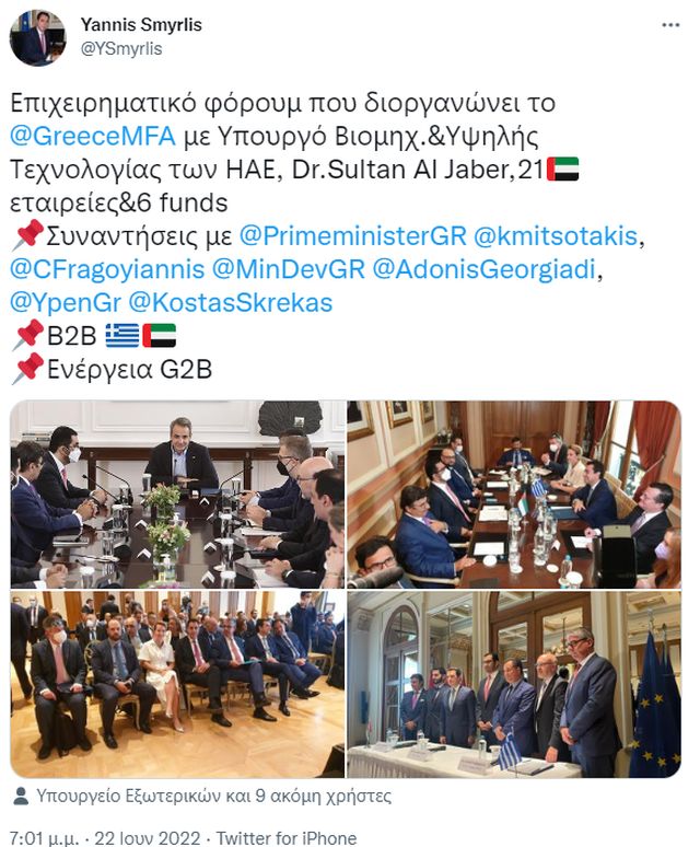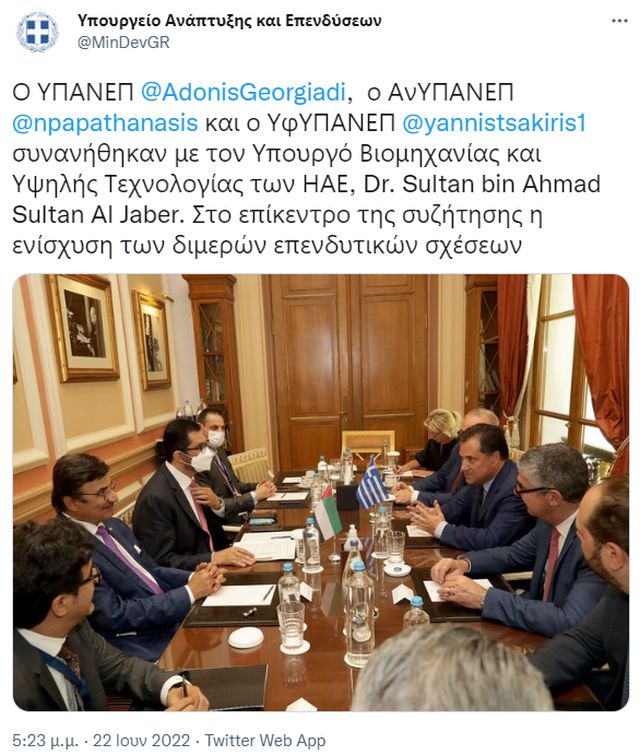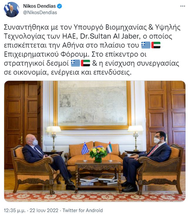 Τέλος, ο Δρ Σουλτάν Αλ Τζάμπερ αναφερθείς στις επαφές του κατά την πρώτη ημέρα της επίσκεψής του, οι οποίες ξεκίνησαν το πρωί της Τετάρτης με τον πρωθυπουργό Κυριάκο Μητσοτάκη και συνεχίστηκαν με τους υπουργούς Εξωτερικών Νίκο Δένδια, Ανάπτυξης και Επενδύσεων Άδωνι Γεωργιάδη και Ενέργειας Κώστα Σκρέκα, καθώς και τον υφυπουργό Εξωτερικών Κώστα Φραγκογιάννη, είπε πως ήταν πλούσιες και ουσιαστικές.