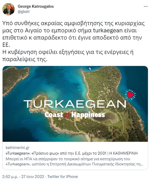 «Υπό συνθήκες ακραίας αμφισβήτησης της κυριαρχίας μας στο Αιγαίο το εμπορικό σήμα turkaegean είναι επιθετικό κ απαράδεκτο ότι έγινε αποδεκτό από την ΕΕ.
