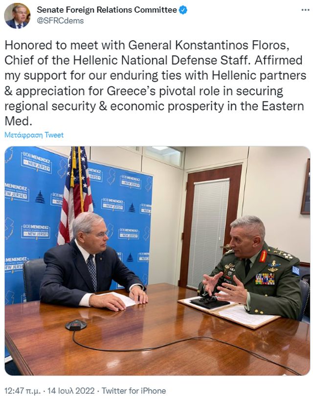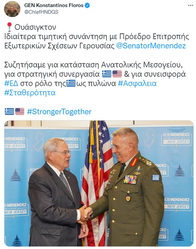 «Επιβεβαίωσα την υποστήριξή μου στους διαρκείς δεσμούς μας με τους Έλληνες εταίρους και την εκτίμησή μου για τον κεντρικό ρόλο της Ελλάδας στη διασφάλιση της περιφερειακής ασφάλειας και οικονομικής ευημερίας στην Ανατολική Μεσόγειο», έγραφε ο Μπομπ Μενέντεζ στο Twitter για τη συνάντηση με τον στρατηγό Φλώρο.