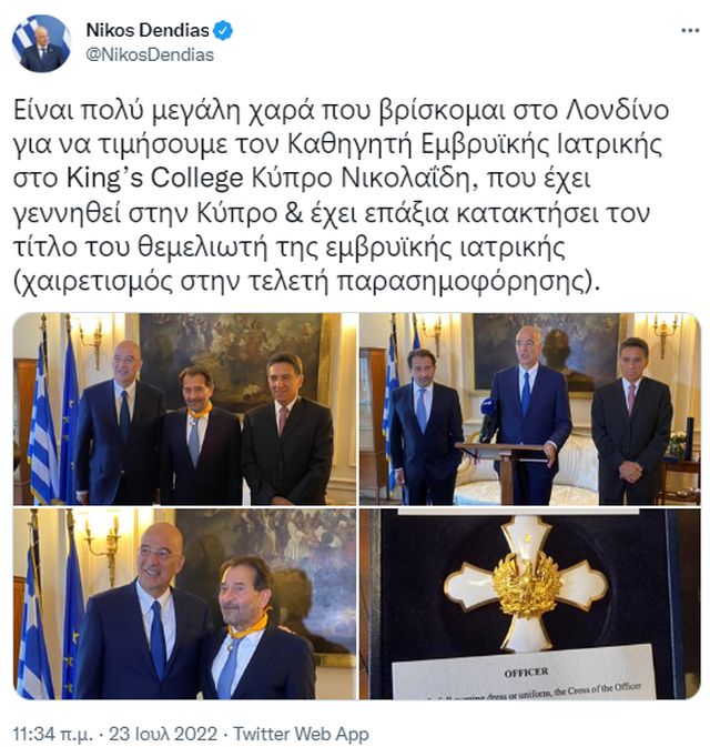 «Επαναλαμβάνω, είμαι ιδιαίτερα περήφανος που είχα τη χαρά να τον παρασημοφορήσω σήμερα» κατέληξε στη δήλωσή του ο υπουργός Εξωτερικών.