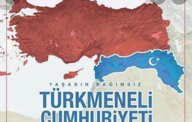 «Ζήτω η ανεξάρτητη Τουρκμενική Δημοκρατία», εννοώντας εδάφη τα οποία η Τουρκία θέλει ν’ αρπάξει από τη Συρία (με μπλε χρώμα στον χάρτη).