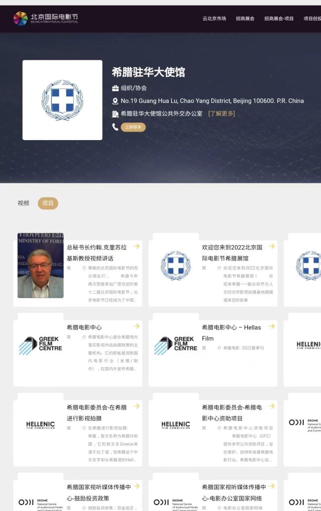 Το ελληνικό Περίπτερο στο διαδικτυακό Market Section του Φεστιβάλ (με επισκεψιμότητα που ξεπερνά το 1 εκατομμύριo ανά ημέρα) πρόβαλε χαιρετισμό του Γενικού Γραμματέα Αποδήμου Ελληνισμού και Δημόσιας Διπλωματίας του Υπουργείου Εξωτερικών, Ιωάννη Χρυσουλάκη, καθώς και πλούσιο υλικό, στην κινεζική και αγγλική γλώσσα, της Πρεσβείας της Ελλάδας στην Κίνα, του Ελληνικού Κέντρου Κινηματογράφου (Hellas Film και Hellenic Film Commission) και του ΕΚΟΜΕ με σκοπό την παρουσίαση των κινήτρων που προσφέρει η χώρα μας σε παραγωγούς οπτικοακουστικού περιεχομένου και των συγκριτικών της πλεονεκτημάτων για την προσέγγιση ξένων κινηματογραφικών παραγωγών.