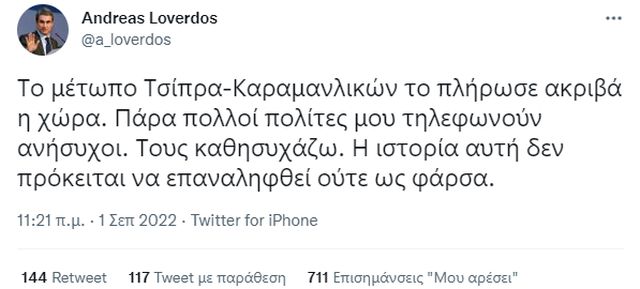 »Η ιστορία αυτή δεν πρόκειται να επαναληφθεί ούτε ως φάρσα», γράφει ο κ. Λοβέρδος.