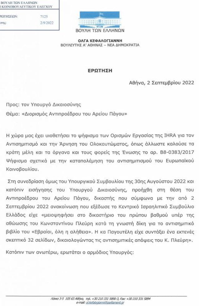 Η βουλευτής της ΝΔ, με ερώτηση προς τον υπουργό Δικαιοσύνης Κώστα Τσιάρα αφού υπενθυμίζει ότι «η χώρα έχει υιοθετήσει το ψήφισμα των ορισμών εργασίας της IHRA για τον ανισημιτισμό και την άρνηση του Ολοκαυτώματος», τονίζει ότι στην πρόσφατη συνεδρίαση του υπουργικού συμβουλίου προήχθη στη θέση του αντιπροέδρου του Αρείου Πάγου, δικαστής που σύμφωνα με το Κεντρικό Ισραηλιτικό Συμβούλιο Ελλάδος «είχε μειοψηφήσει στο δικαστήριο του πρώτου βαθμού υπέρ της αθώωσης του Κωνσταντίνου Πλεύρη κατά τη γνωστή δίκη για το αντισημιτικό βιβλίο του “Εβραίοι, όλη η αλήθεια”.