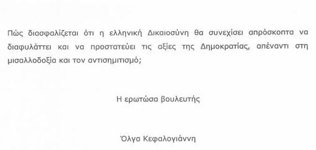 Σε αυτό το πλαίσιο, η Όλγα Κεφαλογιάννη ρωτά τον Κώστα Τσιάρα «πώς διασφαλίζεται ότι η ελληνική Δικαιοσύνη θα συνεχίζει απρόσκοπτα να διαφυλάττει και να προστατεύει τις αξίες της Δημοκρατίας, απέναντι στη μισαλλοδοξία και τον αντισημιτισμό».