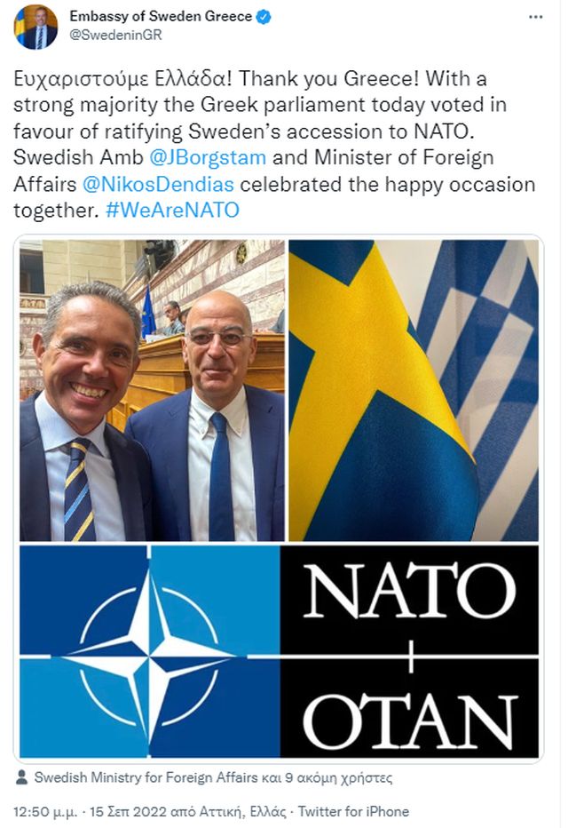 «Ευχαριστούμε Ελλάδα», ανέφερε η πρεσβεία της Σουηδίας σε ανάρτηση στο Twitter, την οποία συνοδεύει και με μια φωτογραφία του Σουηδού πρέσβη Γιόχαν Μπόργκσταμ με τον υπουργό Εξωτερικών Νίκο Δένδια.