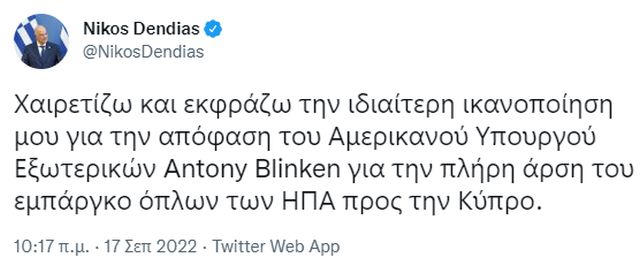 «Χαιρετίζω και εκφράζω την ιδιαίτερη ικανοποίησή μου για την απόφαση του Αμερικανού Υπουργού Εξωτερικών Άντονι Μπλίνκεν (Antony Blinken) για την πλήρη άρση του εμπάργκο όπλων των ΗΠΑ προς την Κύπρο», αναφέρει ο υπουργός Εξωτερικών Νίκος Δένδιας σε ανάρτησή του στο Τwitter.