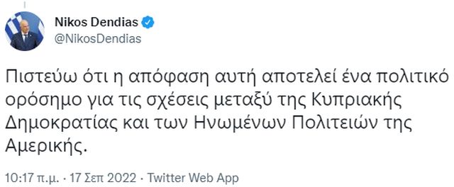 «Πιστεύω ότι η απόφαση αυτή αποτελεί ένα πολιτικό ορόσημο για τις σχέσεις μεταξύ της Κυπριακής Δημοκρατίας και των Ηνωμένων Πολιτειών της Αμερικής», τονίζει χαρακτηριστικά ο κ. Δένδιας.
