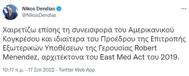 «Χαιρετίζω επίσης τη συνεισφορά του Αμερικανικού Κογκρέσου και ιδιαίτερα του Προέδρου της Επιτροπής Εξωτερικών Υποθέσεων της Γερουσίας Ρόμπερτ Μενέντεζ (Robert Menendez), αρχιτέκτονα του East Med Act του 2019».