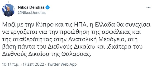 «Μαζί με την Κύπρο και τις ΗΠΑ, η Ελλάδα θα συνεχίσει να εργάζεται για την προώθηση της ασφάλειας και της σταθερότητας στην Ανατολική Μεσόγειο, στη βάση πάντα του Διεθνούς Δικαίου και ιδιαίτερα του Διεθνούς Δικαίου της Θάλασσας», καταλήγει ο υπουργός Εξωτερικών.
