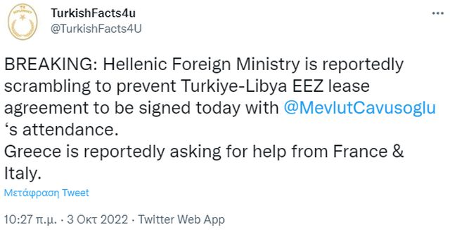 «Το ελληνικό υπουργείο Εξωτερικών φέρεται να προσπαθεί να αποτρέψει τη συμφωνία “μίσθωσης” ΑΟΖ Τουρκίας-Λιβύης που θα υπογραφεί σήμερα με τον Μεβλούτ Τσαβούσογλου», μεταδίδει ο λογαριασμός TurkishFacts4u στο Twitter.