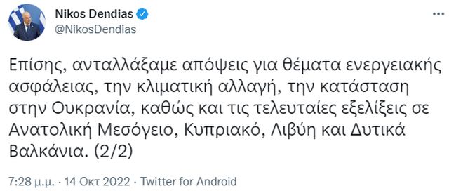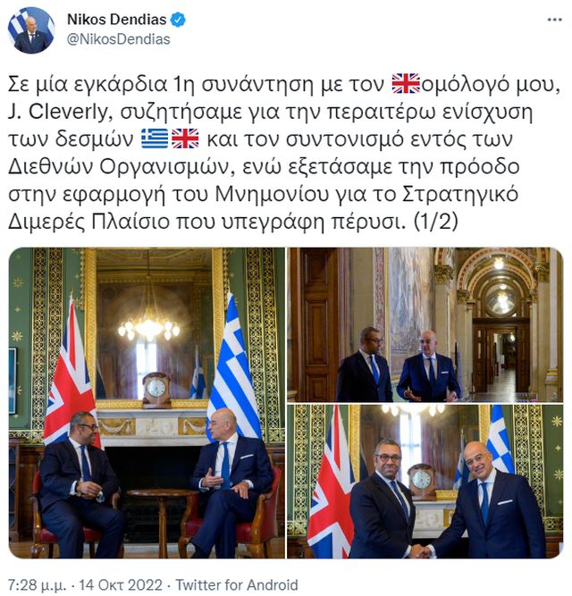 «Θα έχω σήμερα την ευκαιρία να συναντηθώ για πρώτη φορά με τον νέο Υπουργό Εξωτερικών του Ηνωμένου Βασιλείου, James Cleverly.