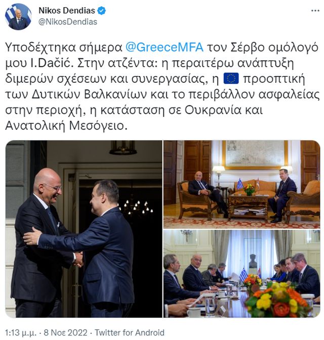 Ο υπουργός Εξωτερικών της Σερβίας αναφέρθηκε στους κοινούς ιστορικούς δεσμούς των δύο χωρών και εξέφρασε τη βούληση της χώρας του για την ανάπτυξη των «καλών διμερών σχέσεων».