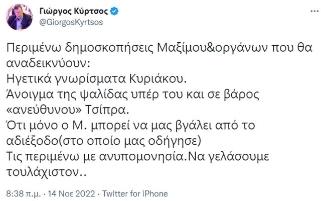 Ο φιλελεύθερος ευρωβουλευτής Γιώργος Κύρτσος με ανάρτηση του στο twitter λοιδωρεί τις επόμενες δημοσκοπήσεις με εντολή Μαξίμου, στον απόηχο της παρέμβασης Μητσοτάκη στην Πολιτική Γραμματεία της ΝΔ.