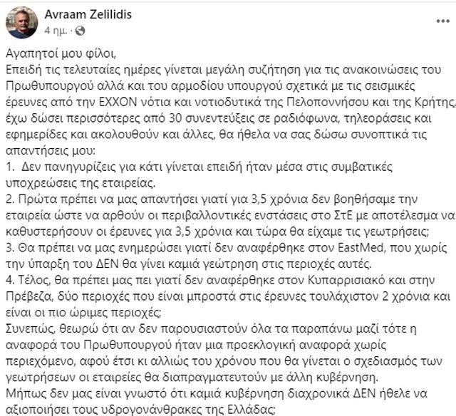 «Επειδή τις τελευταίες ημέρες γίνεται μεγάλη συζήτηση για τις ανακοινώσεις του Πρωθυπουργού αλλά και του αρμοδίου υπουργού σχετικά με τις σεισμικές έρευνες από την EXXON νότια και νοτιοδυτικά της Πελοποννήσου και της Κρήτης», γράφει σε ανάρτησή του στο Facebook ο Αβραάμ Ζεληλίδης, Καθηγητής Γεωλογίας Πανεπιστημίου Πατρών «έχω δώσει περισσότερες από 30 συνεντεύξεις σε ραδιόφωνα, τηλεοράσεις και εφημερίδες και ακολουθούν και άλλες, θα ήθελα να σας δώσω συνοπτικά τις απαντήσεις μου: