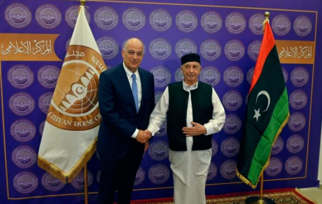 Ολοκληρώνοντας την επίσκεψη του στη Λιβύη, ο υπουργός Εξωτερικών Νίκος Δένδιας συναντήθηκε με τον πρόεδρο της Βουλής των Αντιπροσώπων της Λιβύης και εκπρόσωπο της πόλης Αλ Κούμπα Ακίλα Σάλεχ Ίσα.