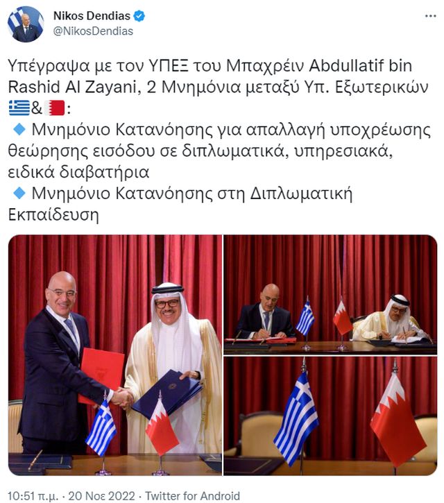 «Προετοιμάζω την επίσκεψη του πρωθυπουργού στο Μπαχρέιν και την υπογραφή επίσης άλλων οκτώ συμφωνιών ανάμεσα στο Βασίλειο και την Ελληνική Δημοκρατία» δήλωσε.