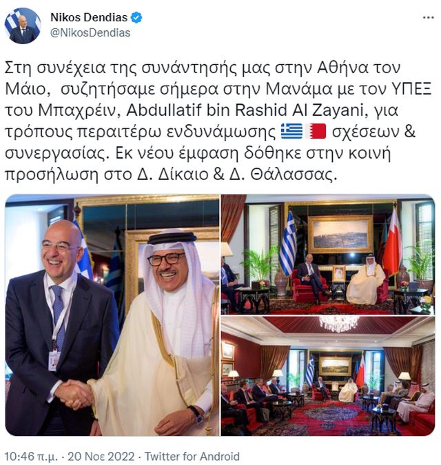 Σε δηλώσεις του σε δημοσιογράφους, μετά τη συνάντηση, ο κ. Δένδιας ανέφερε πως οι σχέσεις της Ελλάδας με το Βασίλειο του Μπαχρέιν και με τις χώρες του Κόλπου, «είναι μια ιστορία επιτυχίας».