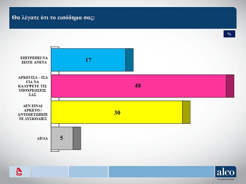 Σε ερώτηση για το εισόδημά τους, το 48% των συμμετεχόντων στη δημοσκόπηση απάντησε ότι αρκεί ίσα-ίσα για να καλύψουν τις υποχρεώσεις τους, το 30% ότι δεν είναι αρκετό και το 17% ότι τους επιτρέπει να ζουν άνετα.
