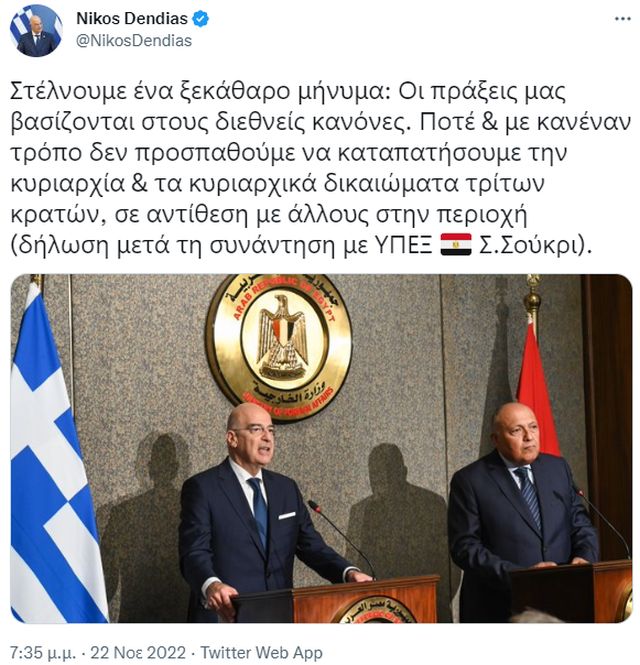 Ο Έλληνας υπουργός Εξωτερικών Δένδιας, ο οποίος συναντήθηκε με τον Αιγύπτιο ομόλογό του δήλωσε ότι αξιολόγησαν επίσης τις πρόσφατες εντάσεις με την Τουρκία, τις εξελίξεις στην Ανατολική Μεσόγειο και τη Μέση Ανατολή, καθώς και τις μακροχρόνιες διμερείς σχέσεις.