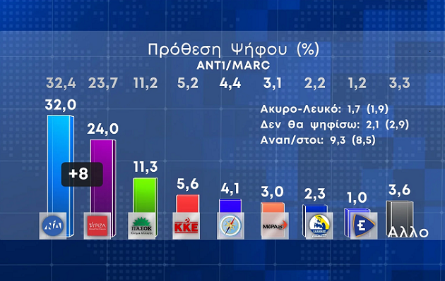 Στη δημοσκόπηση της εταιρείας Marc για τον ΑΝΤ1 η διαφορά της Νέας Δημοκρατίας από τον ΣΥΡΙΖΑ βρίσκεται στις 8 μονάδες.