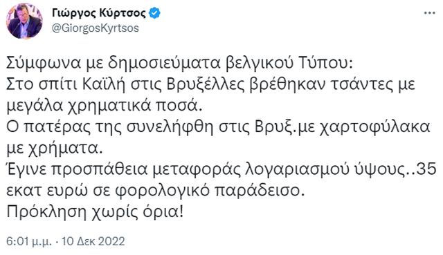 Ο ευρωβουλευτής Γιώργος Κύρτσος γράφει σε ανάρτησή του στο Twitter, αναφορικά με την Εύα Καϊλή ότι, «έγινε προσπάθεια μεταφοράς λογαριασμού ύψους.. 35 εκατ. ευρώ σε φορολογικό παράδεισο», σύμφωνα με δημοσιεύματα του βελγικού Τύπου.