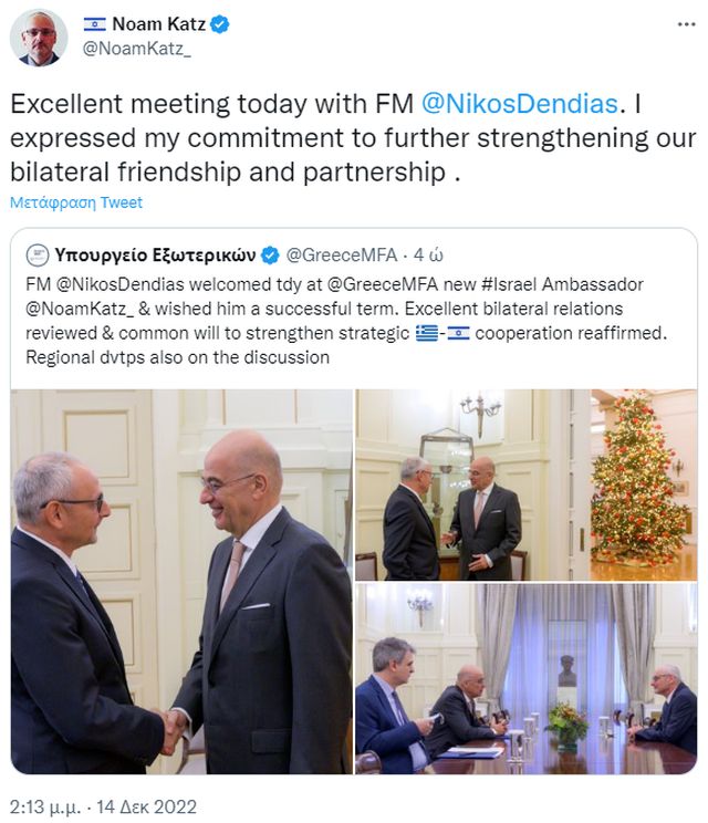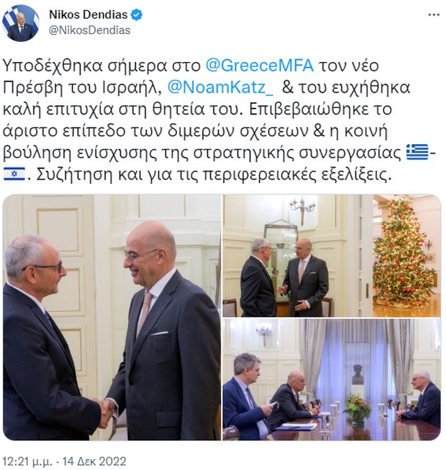«Υποδέχθηκα σήμερα στο ελληνικό υπουργείο Εξωτερικών τον νέο Πρέσβη του Ισραήλ, Νόαμ Κατς, και του ευχήθηκα καλή επιτυχία στη θητεία του.