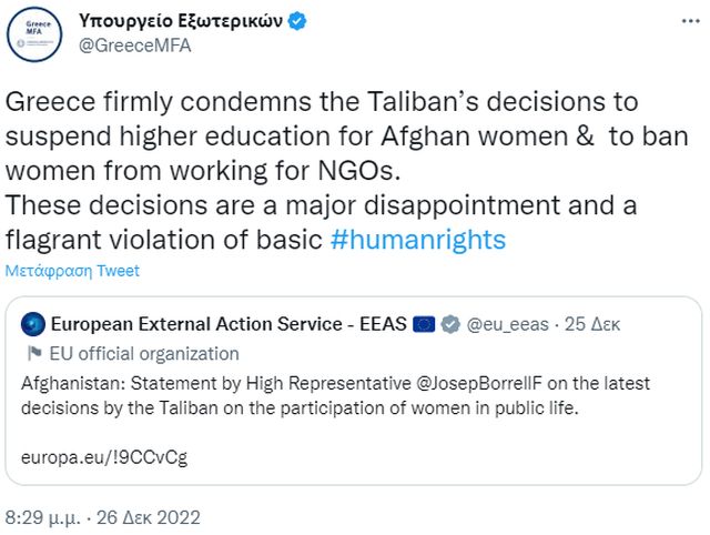 «Η Ελλάδα καταδικάζει απερίφραστα τις αποφάσεις των Ταλιμπάν να αναστείλουν την τριτοβάθμια εκπαίδευση για τις Αφγανές γυναίκες και να απαγορεύσουν στις γυναίκες να εργάζονται σε ΜΚΟ», αναφέρει το υπουργείο Εξωτερικών σε μήνυμα που ανάρτησε στο twitter.