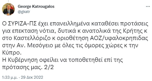 «Ο ΣΥΡΙΖΑ-ΠΣ», αναφέρει ο κ. Κατρούγκαλος, έχει επανειλημμένα καταθέσει προτάσεις για επέκταση νότια, δυτικά κ ανατολικά της Κρήτης και στο Καστελλόριζο και οριοθέτηση ΑΟΖ/υφαλοκρηπιδας στην Αν. Μεσόγειο με όλες τις όμορες χώρες και την Κύπρο.