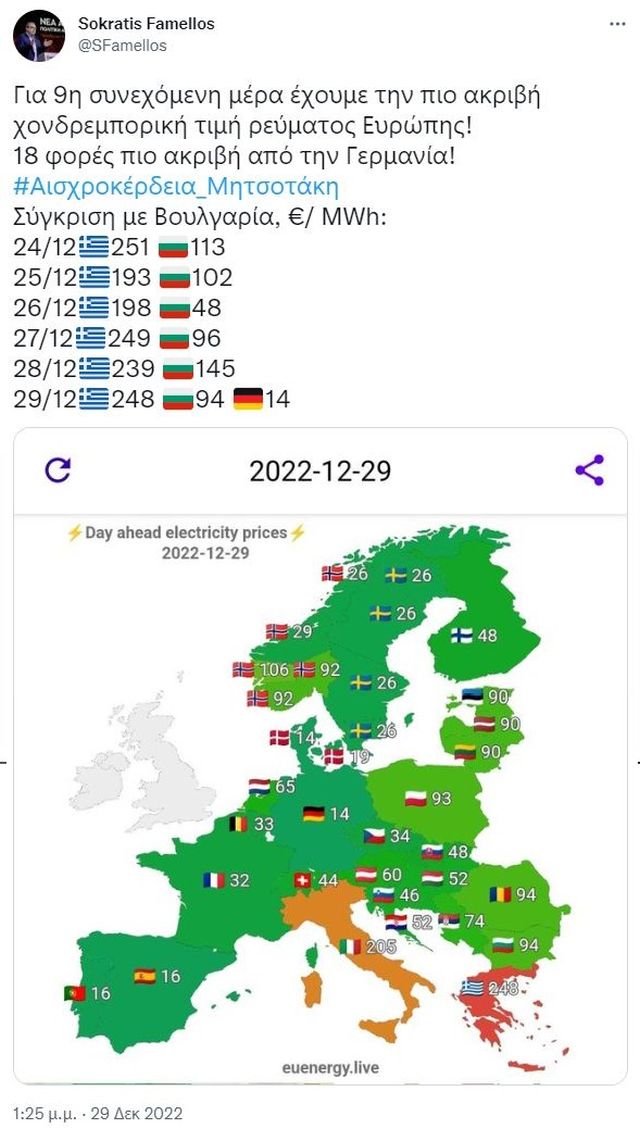 «Για 9η συνεχόμενη μέρα έχουμε την πιο ακριβή χονδρεμπορική τιμή ρεύματος Ευρώπης!», έγραψε ο Σωκράτης Φάμελλος την Πέμπτη στο Twitter.