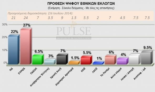 Προβάδισμα πέντε ποσοστιαίων μονάδων του ΣΥΡΙΖΑ έναντι της Ν.Δ., καταγράφει δημοσκόπηση της Pulse που δημοσιεύεται αύριο Πέμπτη, στο «Ποντίκι».