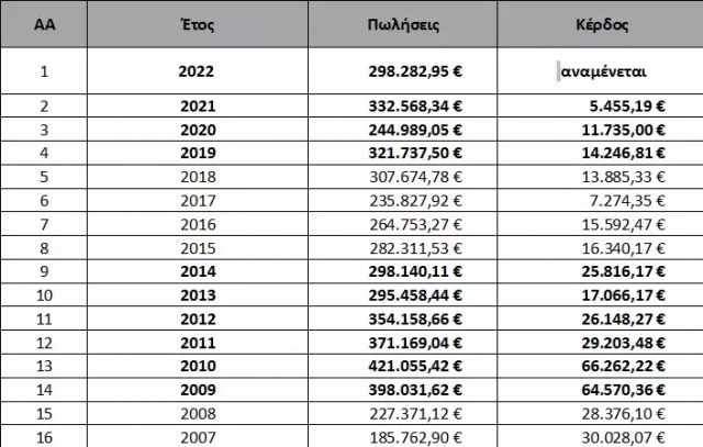»Προς επίρρωσιν των ανωτέρω, παραθέτω τα στοιχεία του Κύκλου Εργασιών και των Κερδών προ Φόρων της εταιρείας μου από το 2006 έως και το 2022 (αναμένεται το 4ο 3μηνο 2022), στον παρακάτω πίνακα.