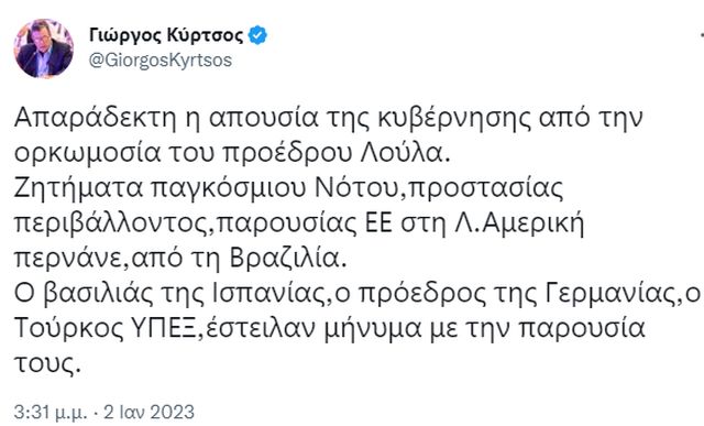 Ως «απαράδεκτη» κρίνει ο ευρωβουλευτής Γιώργος Κύρτσος την απουσία της κυβέρνησης Μητσοτάκη από την ορκωμοσία για την τρίτη θητεία του Λούλα ντα Σίλβα στον προεδρικό θώκο της Βραζιλίας, μέσα από ανάρτησή του στο Twitter.