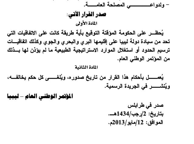 Η απόφαση αυτή ορίζει ότι «απαγορεύεται στην προσωρινή κυβέρνηση να υπογράφει συμφωνίες που περιορίζουν την κυριαρχία του κράτους της Λιβύης στο έδαφός του, καθώς και συμφωνίες για οριοθέτηση συνόρων ή εκμετάλλευση φυσικών στρατηγικών πόρων».