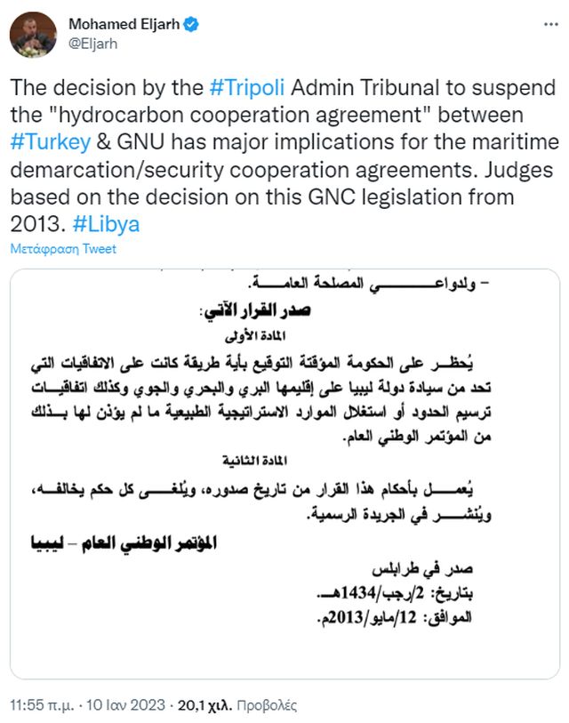 «Η απόφαση του Διοικητικού Δικαστηρίου στην Τρίπολη να αναστείλει τη “συμφωνία συνεργασίας για τους υδρογονάνθρακες” μεταξύ Τουρκίας και GNU έχει σημαντικές επιπτώσεις στις συμφωνίες θαλάσσιας οριοθέτησης/συνεργασίας (και) στον τομέα της ασφάλειας», σχολιάζει ο Μοχάμεντ Ελτζάρχ.